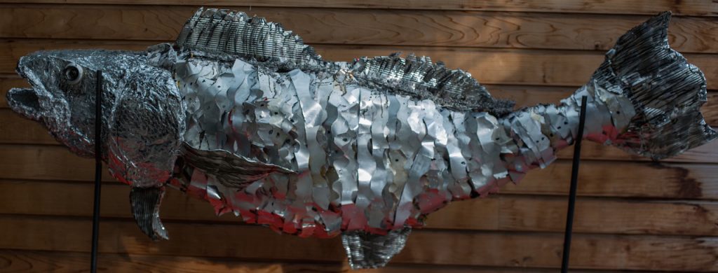 After reading about the endangered Totoaba fish and how they are being hunted to the brink of extinction for their swim bladders Jacha was inspired to create a life sized sculpture of a Totoaba. He recycled cardboard and tin cans to make the sculpture.