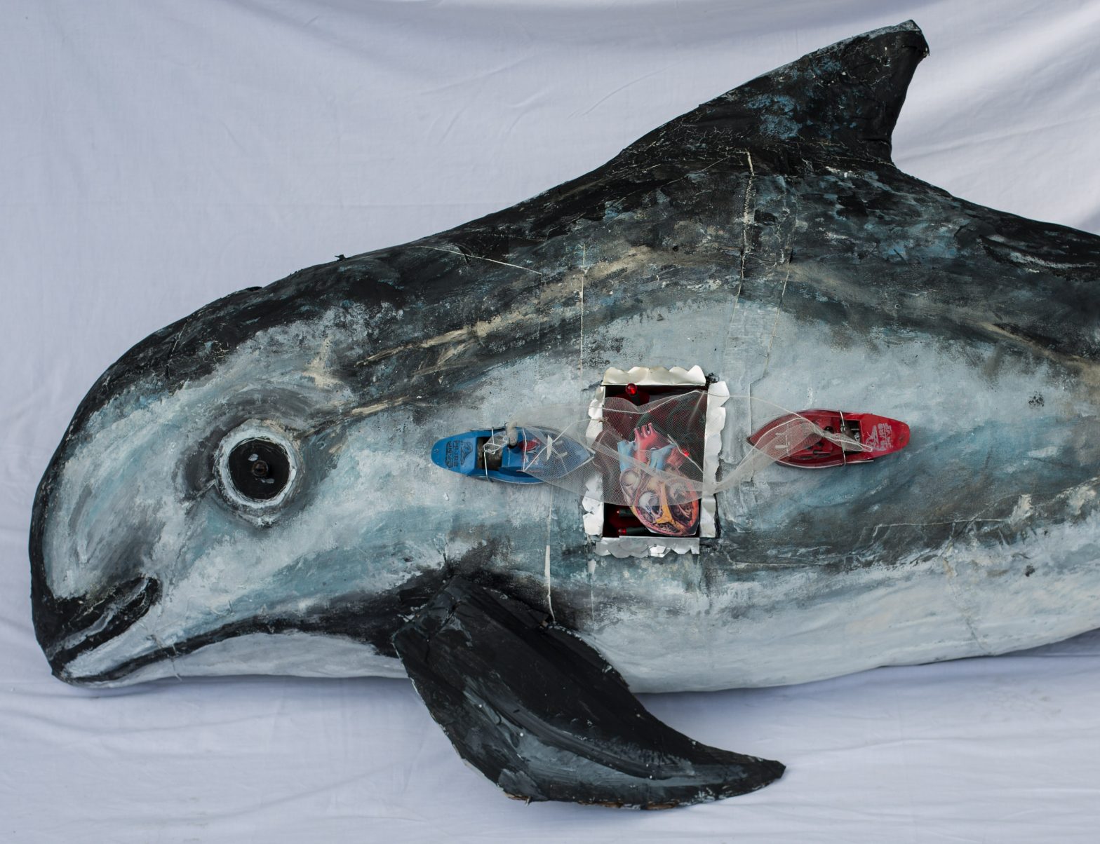 A bycatch of the illegal gilnet fishery for the Totoaba is a small porpoise called the Vaquita. There are estimated to be only 30 Vaquitas led tin the world. After discovering this Jacha then created a life-sized sculpture of a Vaquita to display with the Totoaba in the Galeri.